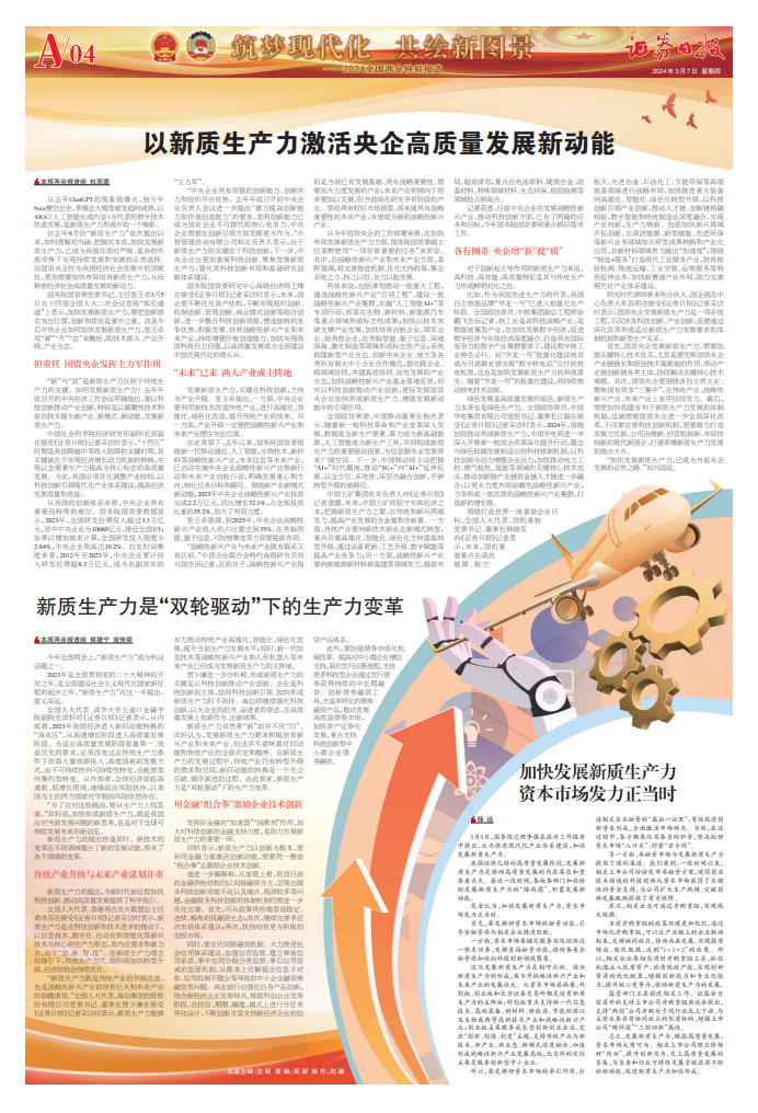 Since "new quality productivity" was first put forward in September last year, how to understand its connotation, grasp its essence and accelerate the development of new quality productivity has become an inevitable choice for China to achieve sustainable development and breakthrough in the face of severe and complicated external situation. As the pillar of China’s economic and social development, state-owned central enterprises need to speed up the layout and cultivate new quality productivity, thus releasing new impetus for high-quality economic and social development.